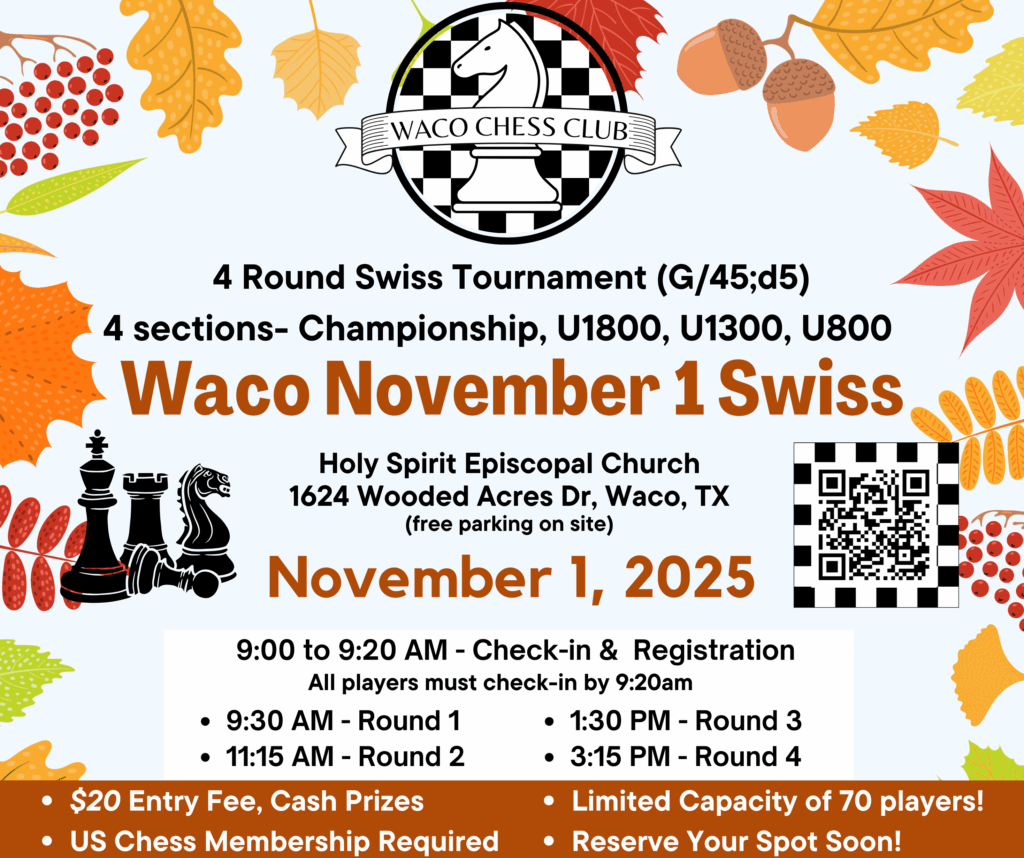 See flyer below, and note from organizers: Since we’re not having a National Chess Day tournament in October, we’re having the special 4-section tournament in Nov.